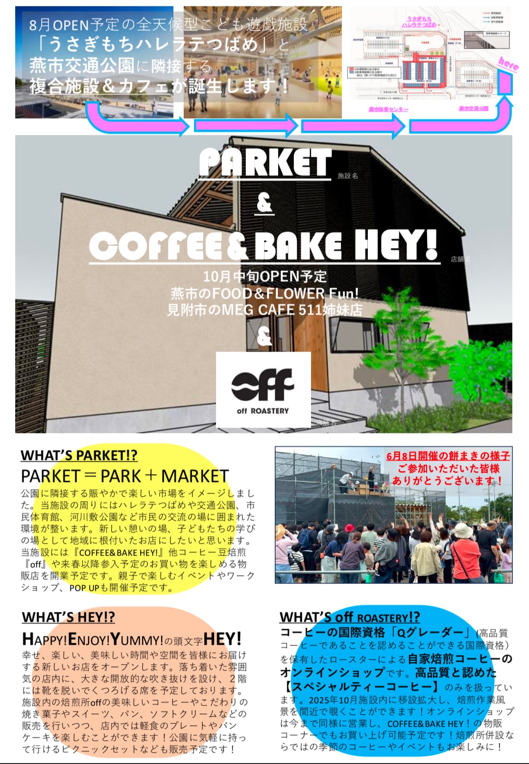 MEGCAFE511(見附イングリッシュガーデン横)やFOOD&FLOWER Fun!(燕市大曲)の姉妹店として新しくオープンする『PARKET』(パーケット)という複合施設のテナントとして焙煎工房を構えさせていただきます。PARKETにはoffの焙煎工房と、offで焙煎したコーヒーを楽しむことができる『COFFEE&BAKE HEY!(コーヒーアンドベイク ヘイ!)』というカフェが入ります。来春以降は多種多様なショップがPARKETに集まる予定です。